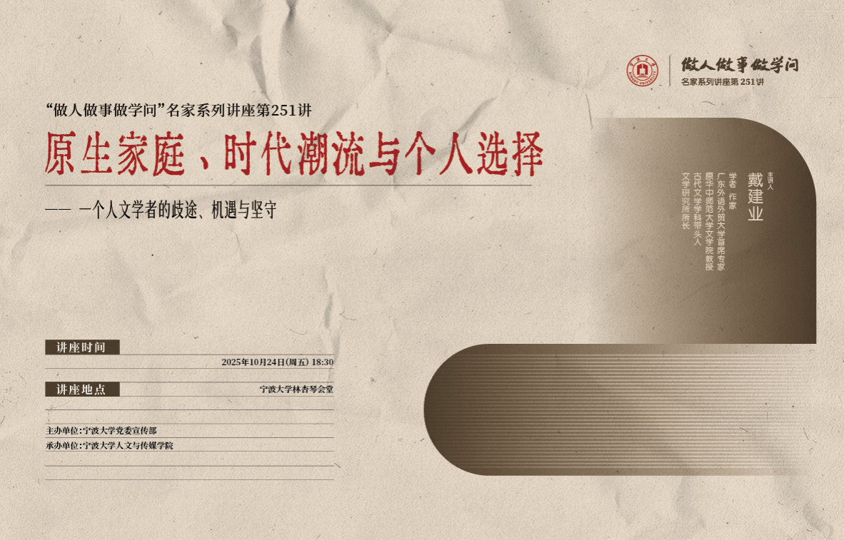 2025年10月24日,学者、作家戴建业即将来校主讲“做人做事做学问”名家系列讲座第251讲。讲座主题:原生家庭、时代潮流与个人选择——一个人文学者的歧途、机遇与坚守。